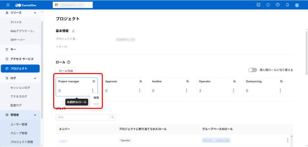 CentralOneでは、不可欠な固定ロールである「プロジェクトマネージャー」を提供しています。このロールには、削除できない、重複できない、そしてデフォルトで最高権限を持つという特性があります。プロジェクトマネージャーの存在は、システム内に全面的な権限を持つコア管理者を確保し、プロジェクトの円滑な実行を調整する役割を果たします。