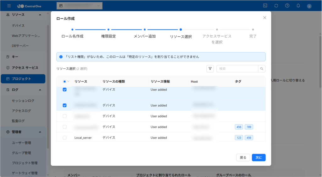 このロールがアクセスできるリソースを指定します。これには、CentralOne内のデータベース、ファイル、または他の資産が含まれる可能性があります。