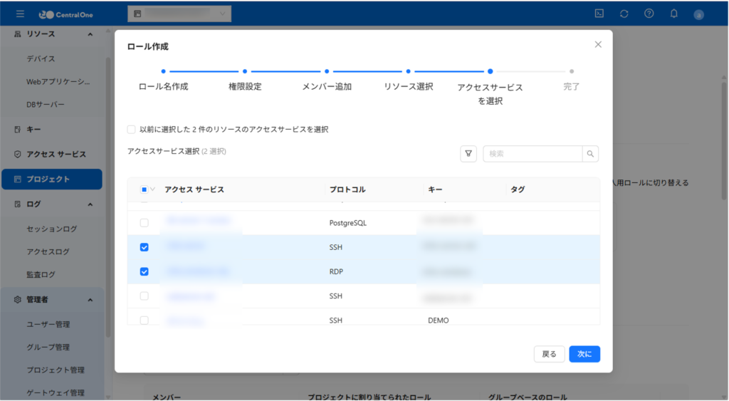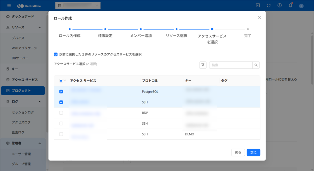 このロールが利用できるアクセスサービスを選択します。このロールのメンバーが使用できる具体的な機能とサービスを特定します。