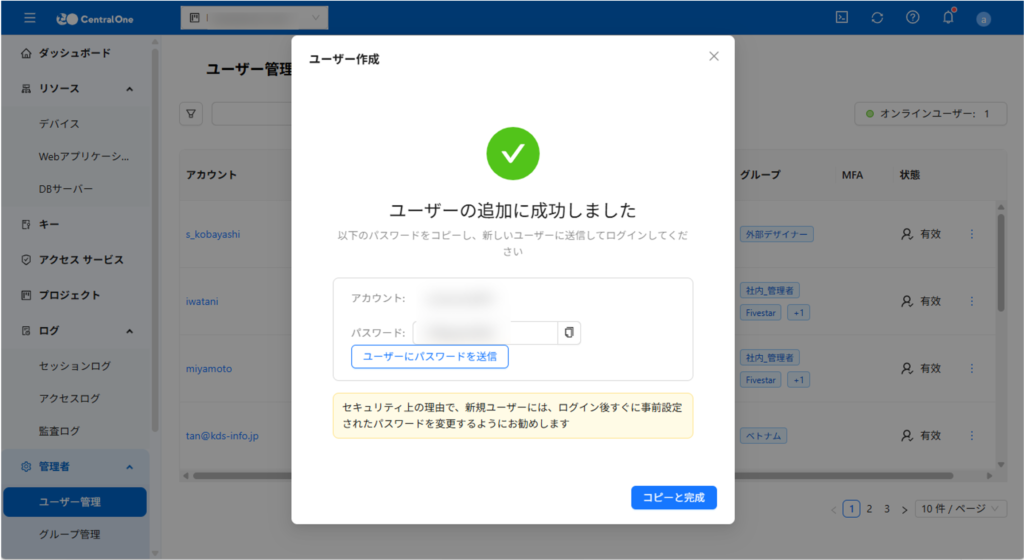 7. 新しいユーザーが作成された後、コピーしたパスワードをそのユーザーに送信してください。