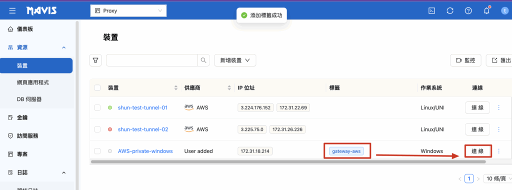 三、Gateway サーバーを通じて同じ VPC 内の機器に接続します。
