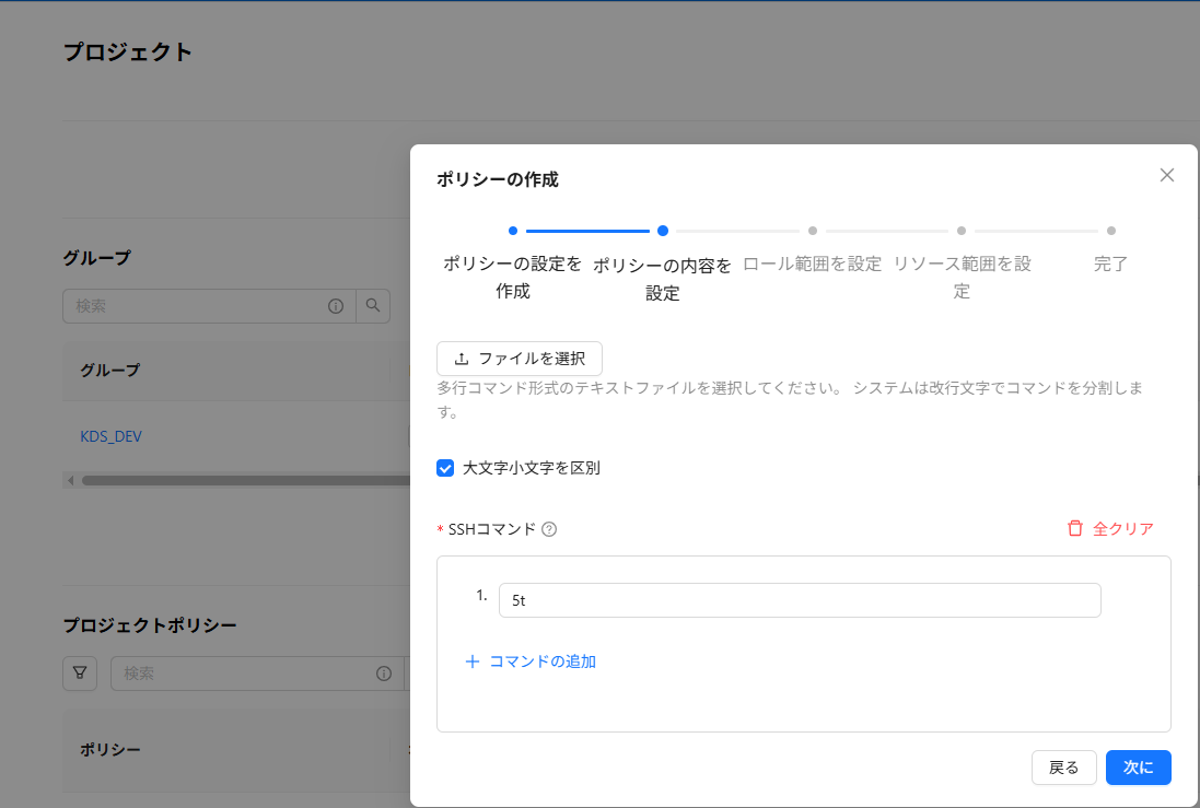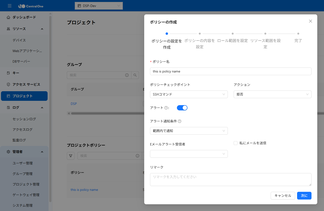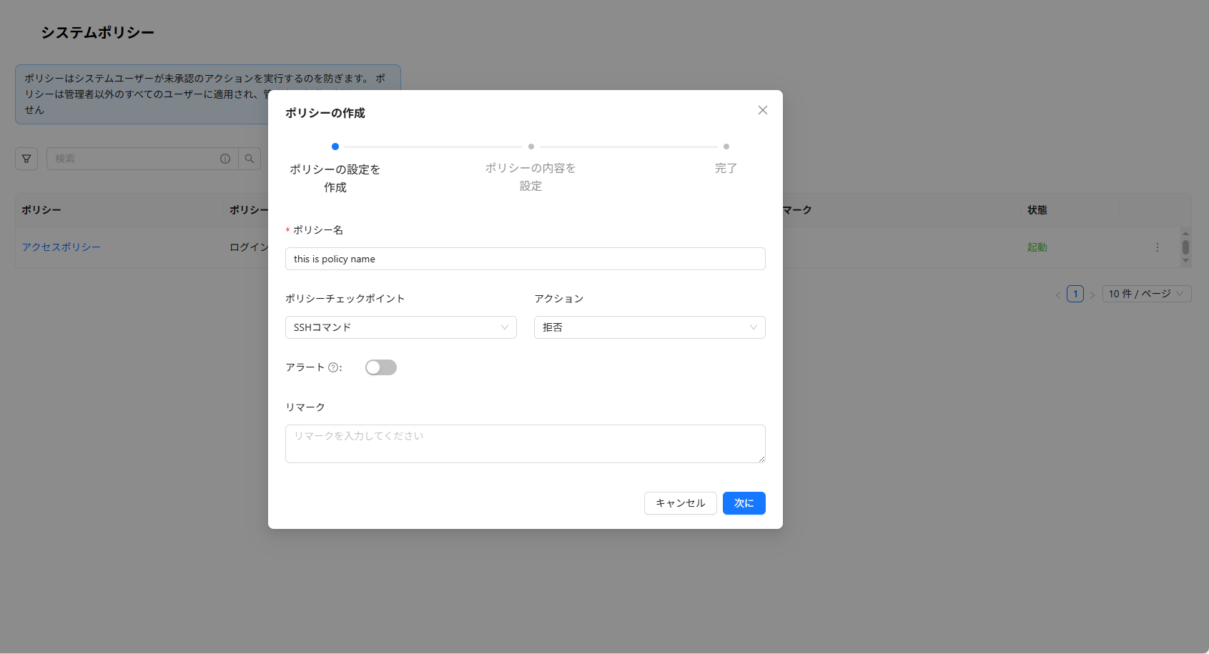 ポリシー名を入力し、ポリシーのチェックポイントでSSHコマンドを選択し、行動を「無効」に選択します。警告を選択すると、特定のコマンドがトリガーされた場合、プロジェクト管理者が即座に通知を受け取りますが、ブロックはされません。