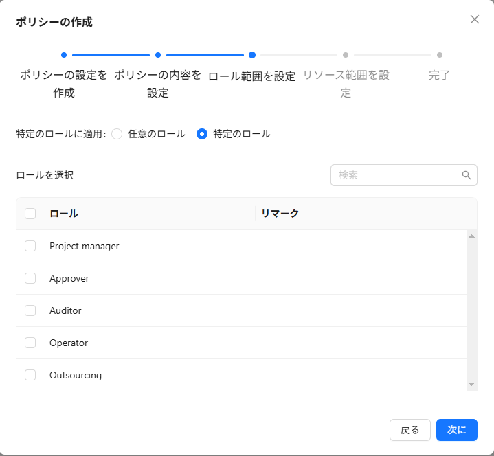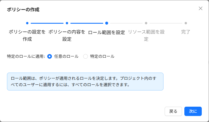 プロジェクトポリシーには、システムポリシーよりもロールとリソースの設定範囲が多くあります。プロジェクトの要件に応じてポリシーの適用範囲をカスタマイズできます。