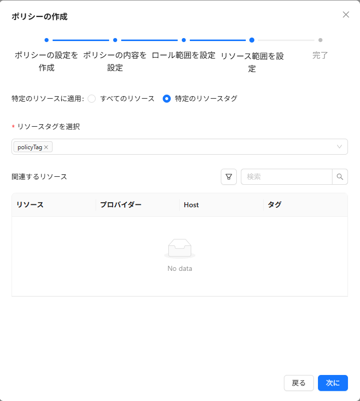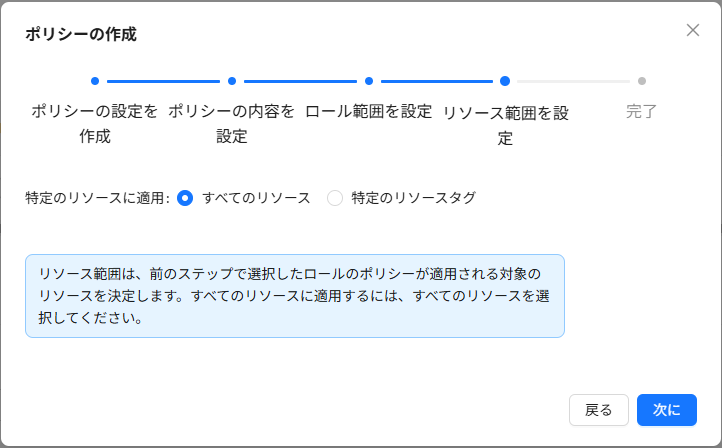 リソースに対しては、すべてのリソースを選択するか、特定のリソースに対するタグを選択することができます。すべてのリソースを選択した場合、そのプロジェクト内のすべてのデバイスがポリシーの影響を受けます。