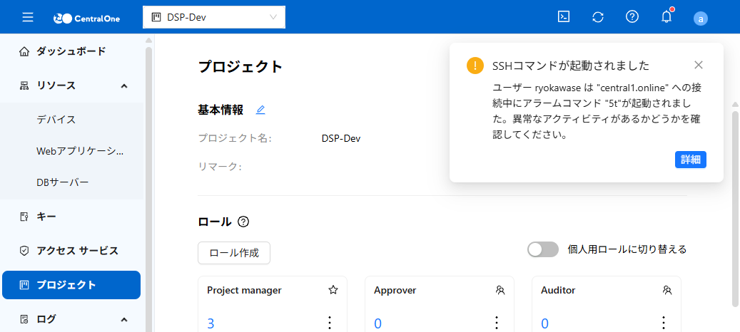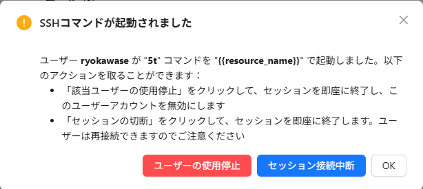 現在、プロジェクトポリシーに影響を受けているユーザーは、SSH接続中に “5t” を入力した場合、プロジェクト管理者は即座に通知を受け取ります。プロジェクト管理者はユーザーの接続を即座に切断することができます。