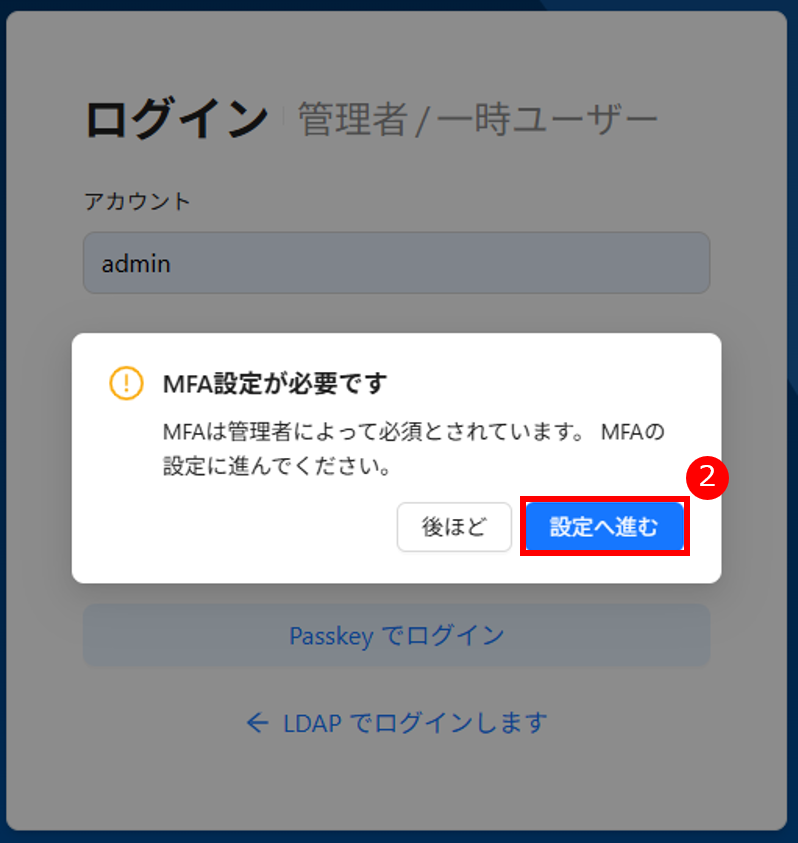 1. MFA を有効にしていないユーザーがログインすると、MFA 設定画面が表示されます。