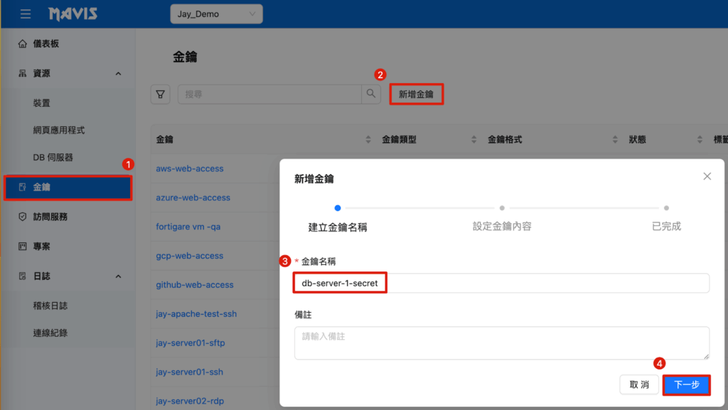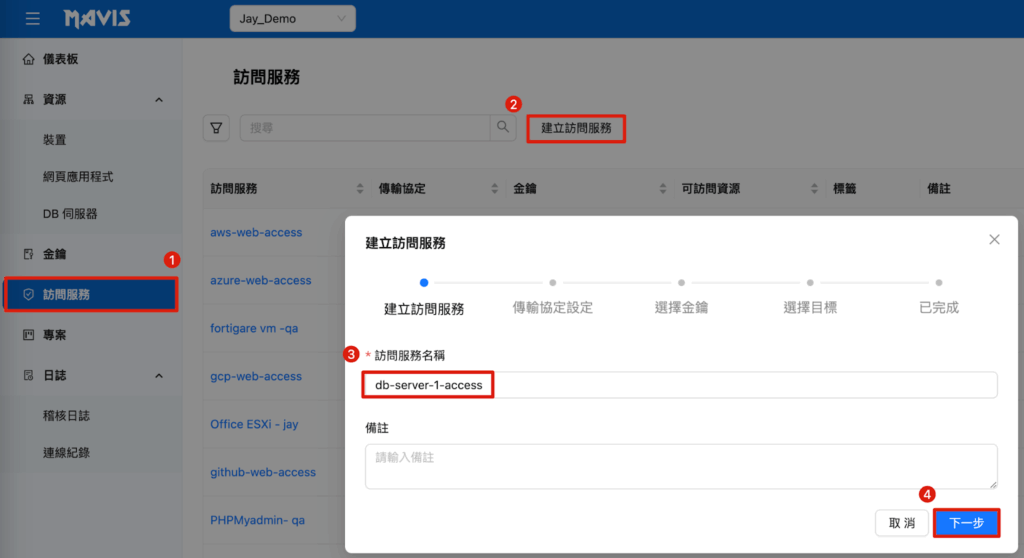 | 1. 「訪問サービス」をクリック 2. 「訪問サービスの作成」をクリック 3. カスタム訪問サービス名を入力 4. 次へ |