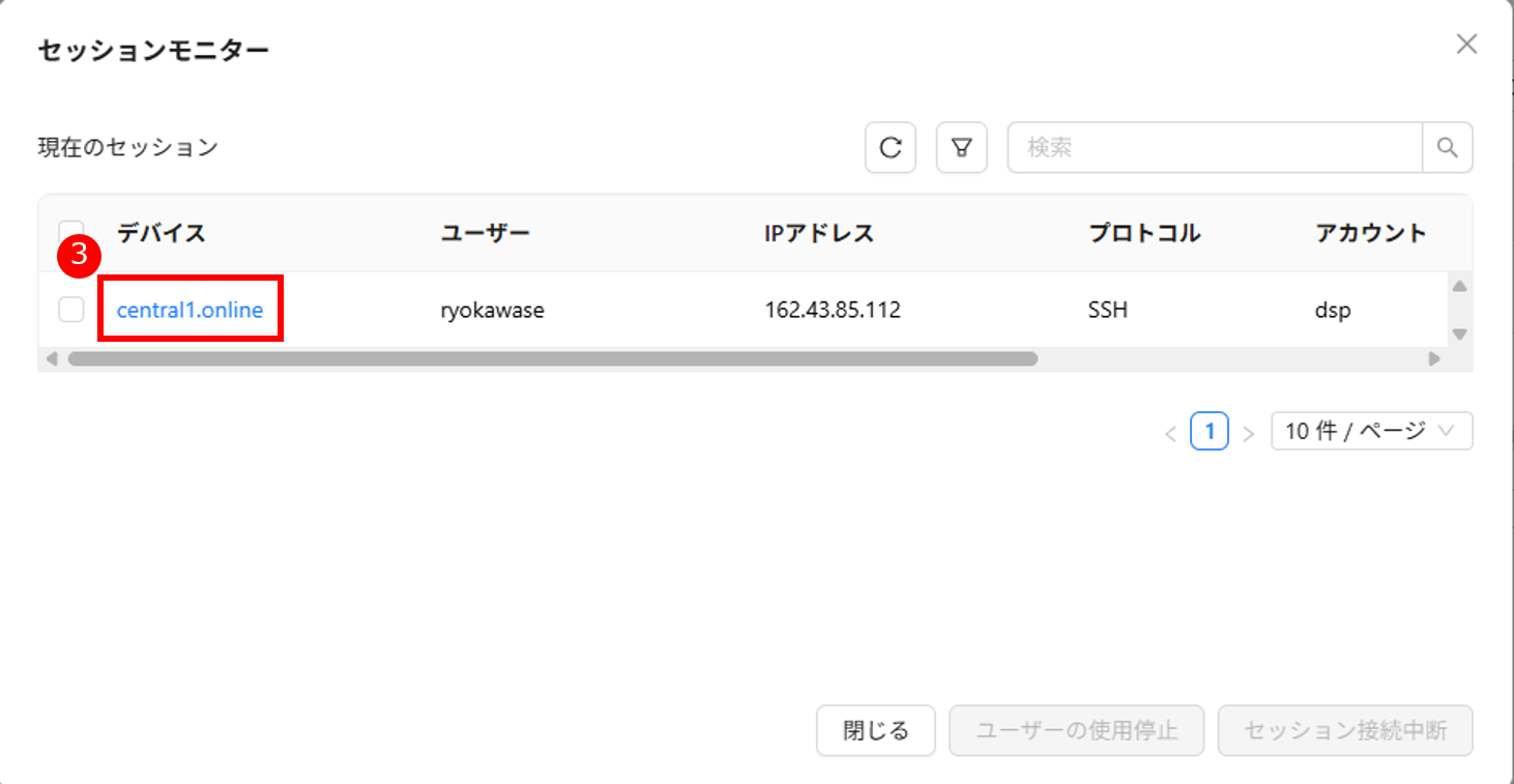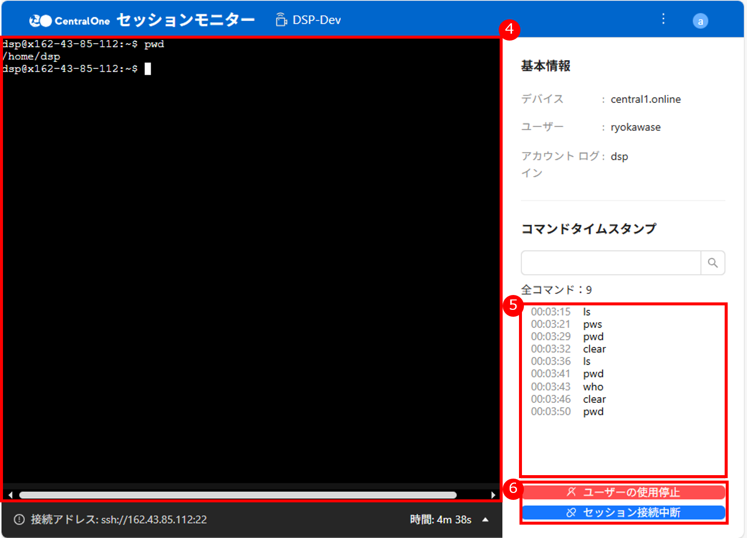 CentralOne プラットフォームを介して SSH、RDP、または Web ホスト接続を行う際、管理者または接続監視権限を持つ人は、ユーザーの操作画面をリアルタイムで監視できます。異常な操作行動が発見された場合、管理者は直ちに接続を切断するか、ユーザーアカウントを無効化してシステムのセキュリティを確保できます。