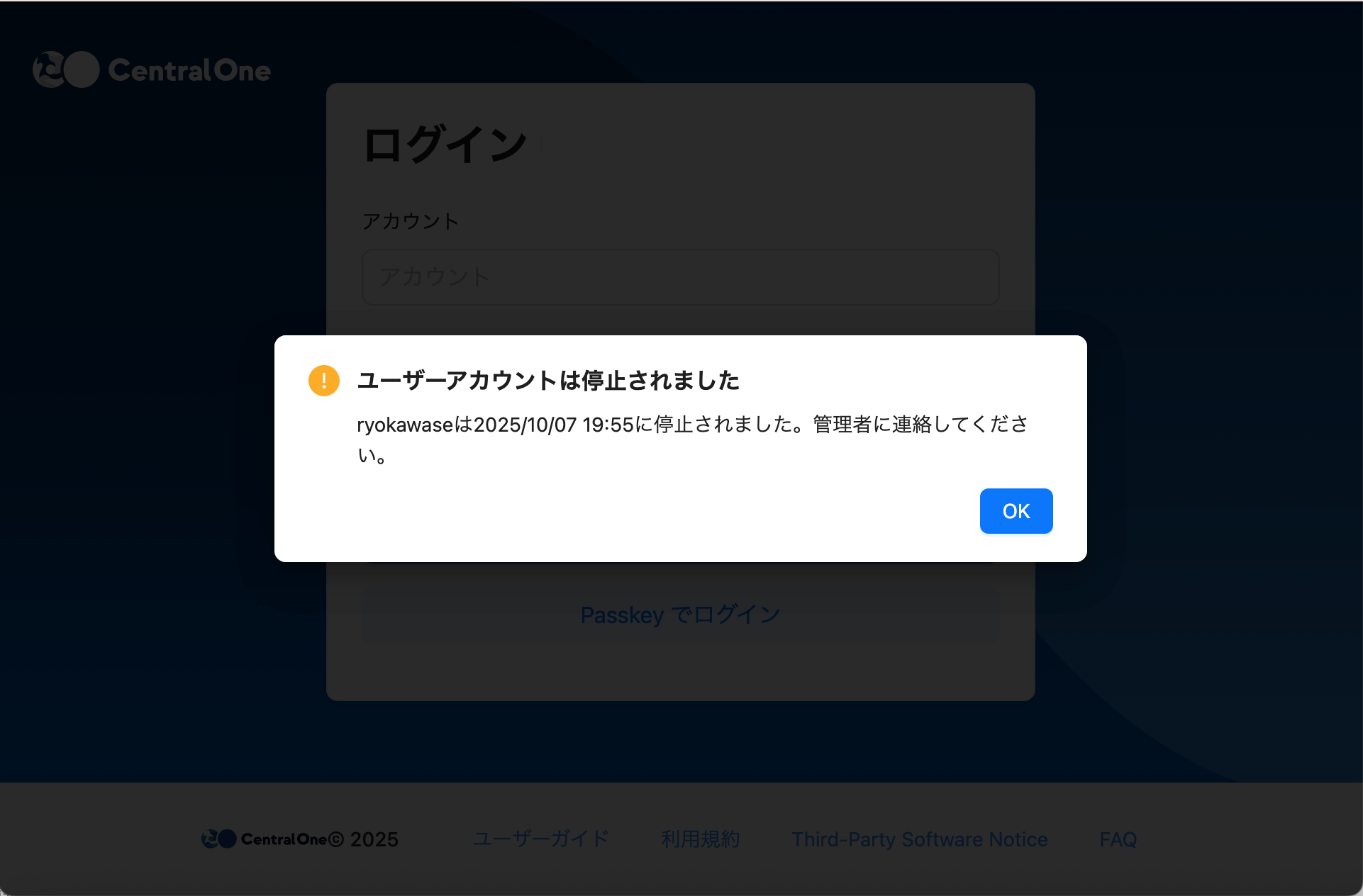 管理者が「ユーザーの無効化」を実行した後、ユーザーの画面にはアカウントが無効化されたメッセージが表示されます: