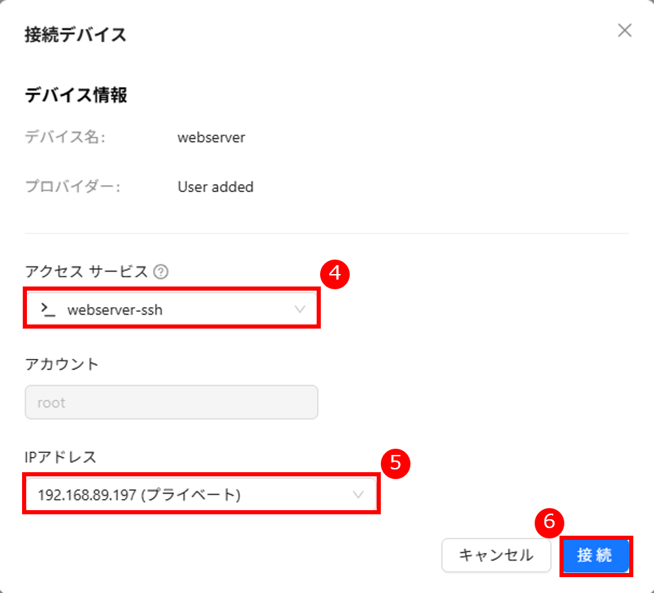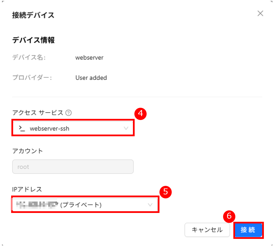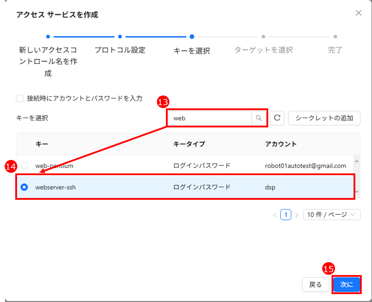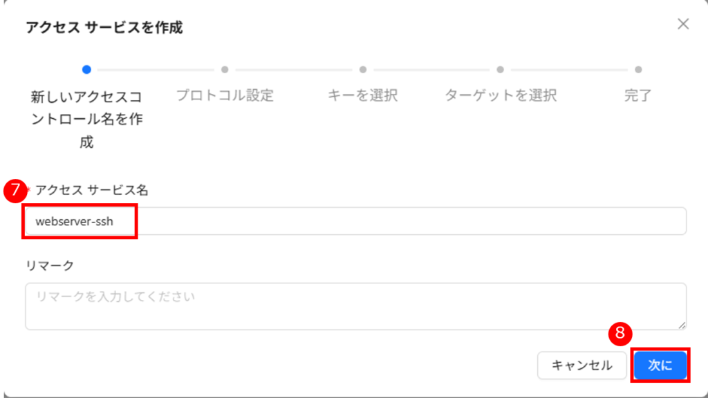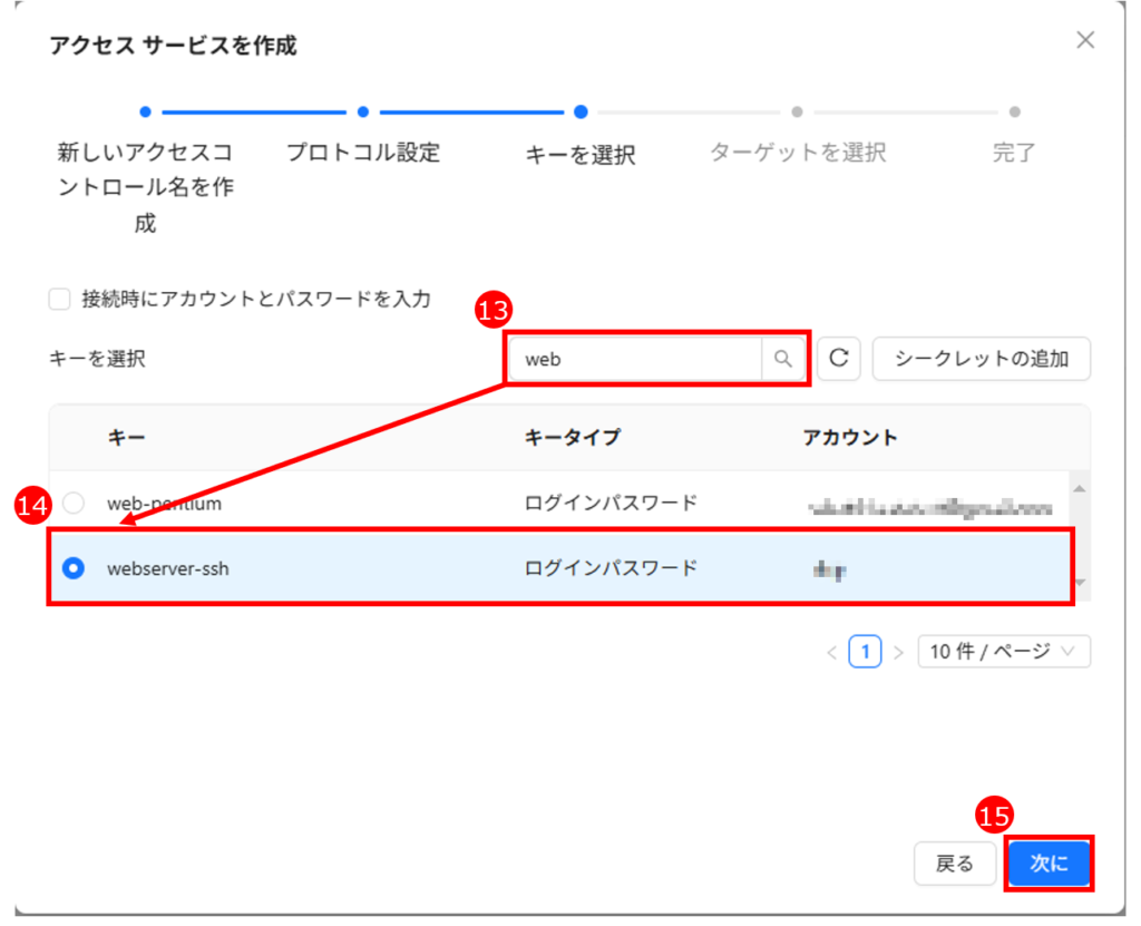 「アクセスサービス」は、サーバーのログイン「アカウント/パスワード」または「アカウント/SSH 鍵」および接続プロトコルなどの情報を記録します。