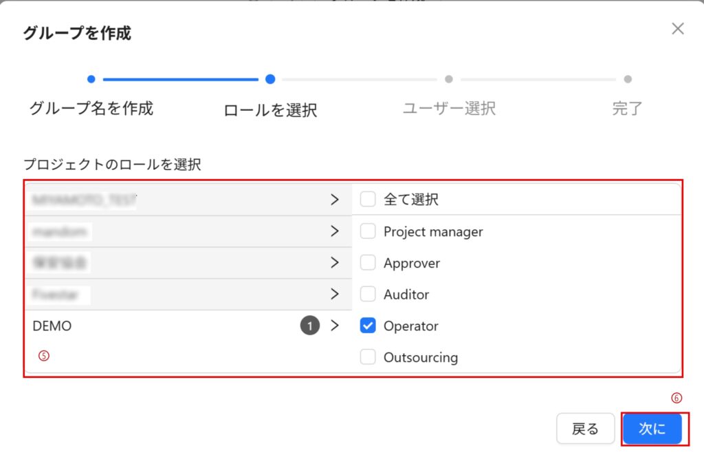 6. プロジェクトごとの役割選択:そのグループの権限に応じてプロジェクト内の役割を選択してチェック