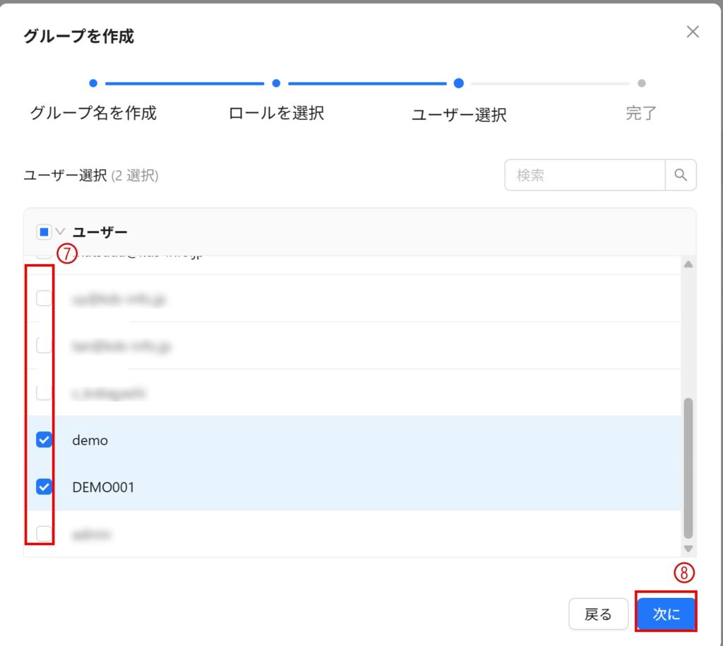 8. ユーザー選択:ユーザーをチェックしてそのグループに追加